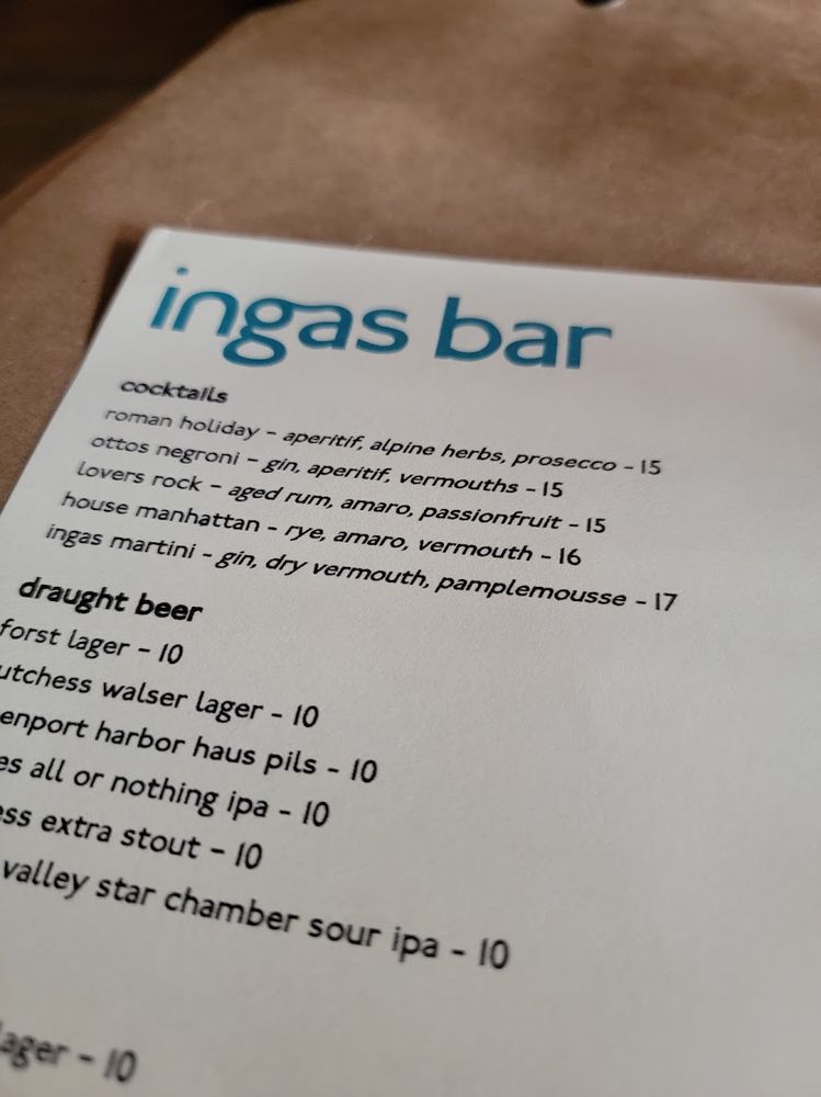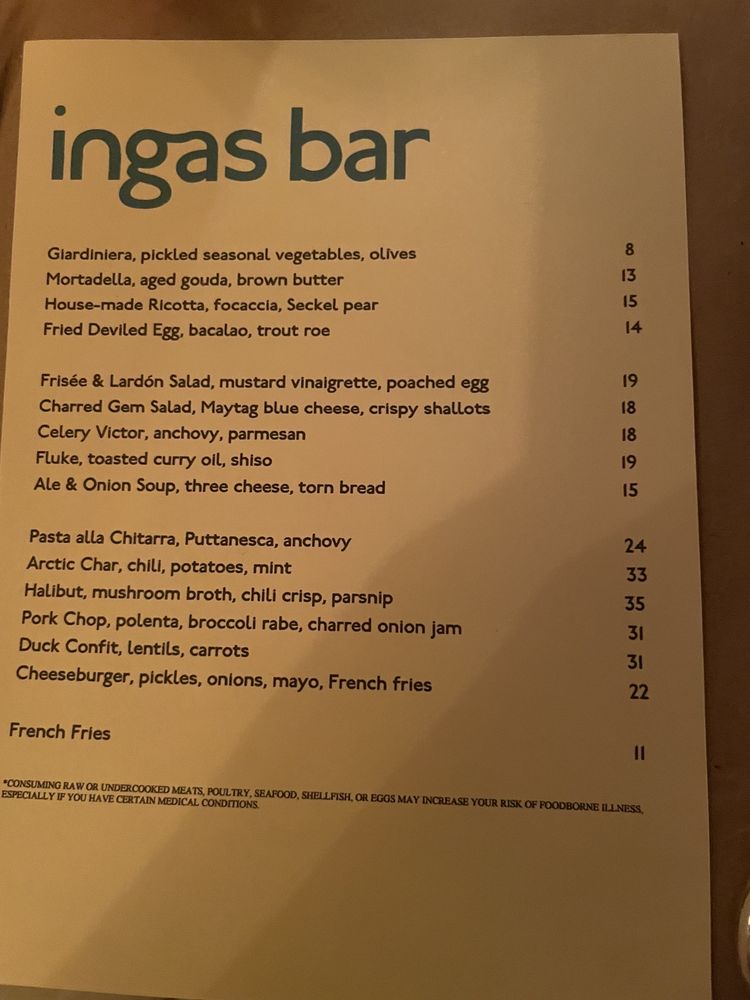 Introducing Ingas Bar, a hidden gem in Brooklyn Heights specializing in New American cuisine. Located at 66 Hicks St, this cozy spot offers a unique dining experience with its upscale yet welcoming atmosphere. Known for exceptional dishes like the Duck Dat Potatoes and the Victor Salad, prepared with creativity and precision. The menu changes seasonally, ensuring fresh and exciting options with each visit. The attentive and friendly staff, along with the expertly crafted cocktails, add to the overall delightful dining experience. Whether you're stopping by for brunch or a special dinner, Ingas Bar is sure to impress with its impeccable service and mouth-watering dishes. Make a reservation today and indulge in a culinary journey you won't soon forget.